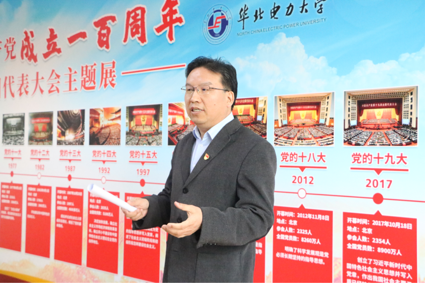 首先,孙平就学院本次举办中国共产党历次全国代表大会主题展的缘起、筹备过程、整体设计、教育意义做了简要介绍。他说,为迎接党的百年华诞,beat365中文登录入口以党的十九次党代会为主题,以党的理论与实践飞跃为主线,以党的理论逻辑、历史逻辑和实践逻辑为脉络,特举办中国共产党百年华诞党史主题展。本次展览对党的一大至十九大精心梳理,回顾党自成立以来的辉煌之路。80块展板介绍了中国共产党诞生的历史背景,并将党的历次全国代表大会的基本情况、领导集体、历史意义及重要史料进行系统呈现,展览还以专题展板的形式概括了毛泽东思想、邓小平理论、“三个代表”重要思想、科学发展观、习近平新时代中国特色社会主义思想等中国共产党取得的马克思主义中国化的系列重要理论成果,辅之以21根立柱将中国共产党不同时期多位重要领导人的经典语录进行展示,起到了全方位、立体化的宣传效果,充分再现了中国共产党不断探索马克思主义中国化的历史进程,体现出中国共产党是人民的政党,是与时俱进,永葆青春的政党。