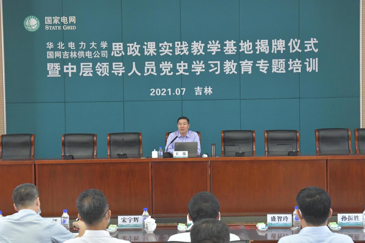 19日中午,实践团来到国网吉林供电公司机关二部参加beat365中文登录入口思政课实践教学基地揭牌仪式。吉林公司党委书记朱晓锋、学院院长王伟出席仪式并致辞,吉林公司副总经理宋宇辉、学院党总支书记孙平出席仪式并共同为思政课实践教学基地揭牌。吉林公司纪委书记、工会主席孙振胜主持仪式。此次思政课实践教学基地的建立,不仅是探索实践校企合作新模式,弘扬马克思主义思想理论,更是将理论与实践相结合,将党的思想文化与电力行业发展相关联,既丰富思政教育新路径,又从现实中探索实践新课题,为深化党史学习教育、强化思想政治建设注入了新的活力。思政课实践教学基地的落成可以进一步促进思政课小课堂同社会大课堂、学生实现理论与实践、学生把学习奋斗的目标同民族复兴的伟大目标进行充分融合,有利于学院教师将理论研究和吉林公司党建创新实践进行有效结合。思政课实践教学基地的成立,必将为校企之间开展合作交流搭建新的平台和载体,学院将利用好这一平台载体,充分利用好吉林市红色文化资源及红色基因,与吉林公司共同为学院学子深入了解国情、加快历练成长提供良好的学习实践机会,学院将和吉林公司共同探索党史学习教育和党建创新的新模式,为电力行业提供更多人才和智力支撑。揭牌仪式结束后,王伟为吉林公司中层领导人员讲授专题党课。