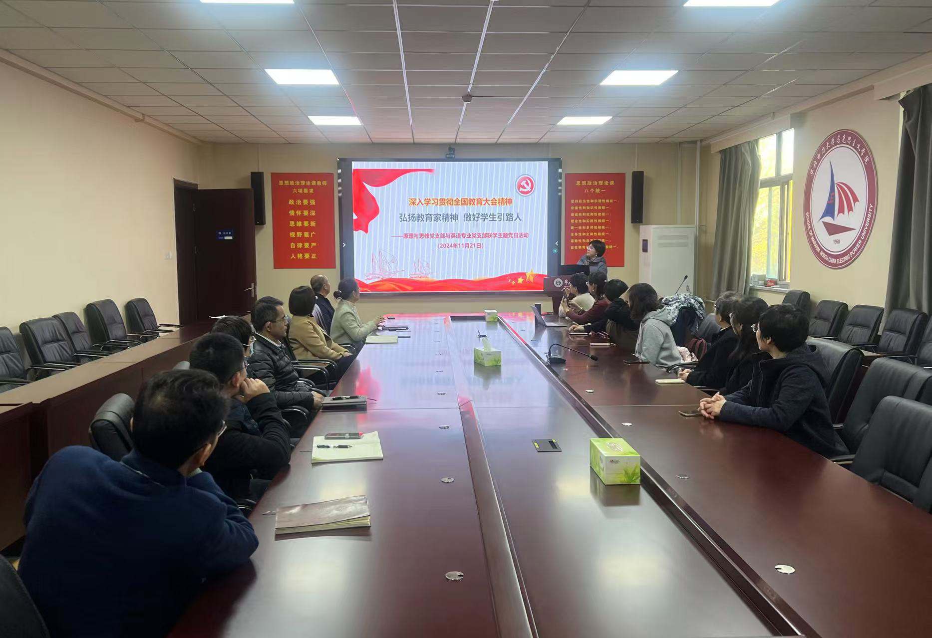 为深入学习贯彻习近平总书记重要讲话和全国教育大会精神,进一步凝聚思想共识、强化使命担当,推动党中央关于建设教育强国的重大决策部署落实落地,2024年11月21日,beat365中文登录入口原理与思修党支部与外国语学院英语专业党支部开展联学共建,进行“弘扬教育家精神 做好学生引路人”主题党日活动,本次活动由原理与思修党支部书记吴宁宁主持,外国语学院英语专业党支部书记郑蓉颖进行总结。