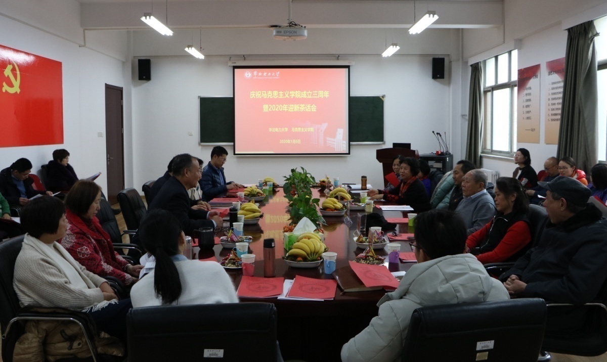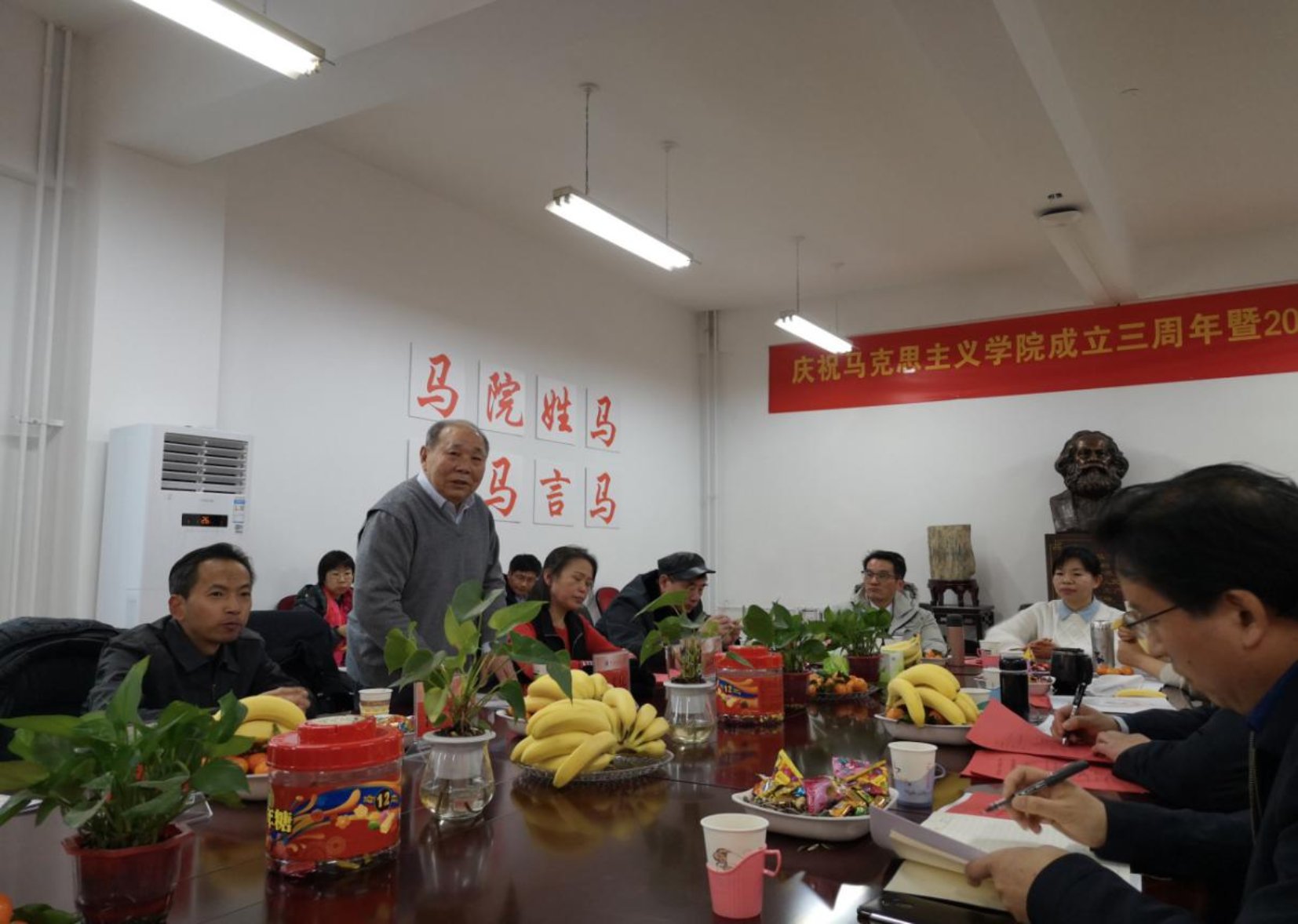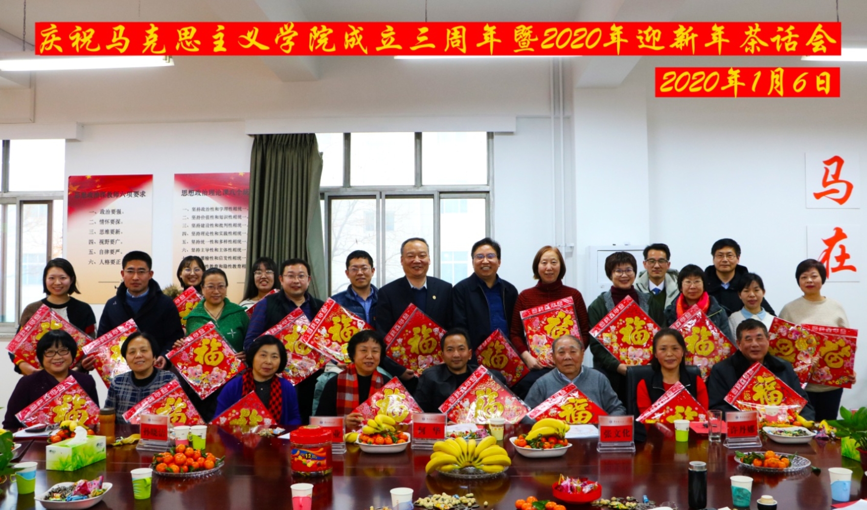 最后,何华代表学校对学院成立三周年表示热烈的祝贺,对老教师们表示衷心的敬意,并对学院未来的发展表示深深祝福,预祝学院在新的一年里更进一步。在对学院工作肯定和鼓励的同时,何华指出,中央对于思政课建设寄以极大的期望和重视,希望学院全体教师要不负中央重托,牢记立德树人使命,讲好思政课,为党和国家培养社会主义建设者和接班人。他强调,当今世界面临百年未有之大变局,世界局势风云变幻,各种不确定性增加,2020年又是全面建成小康社会的决胜之年,对于我们国家的发展具有非常重要的承上启下作用。在历史的关键节点,学生有很多的成长疑惑需要思政课教师拨云见日。为此,他对思政课教师提出四点希望:一、不忘初心,牢记使命,不断加强自身的主动性、积极性;二、重视研究学生受众特点,以学生满意度为导向,不断改革创新教学课程、教学风格、教学方法,不断提升教学质量;三、加强教师自身的人格魅力和品德修为,身教言传合力教育学生,实现显性教育和隐性教育相结合;四、关注国内外大事,加强自身的理论学习,将最新知识融入课堂。他祝愿学院全体教职工在新的一年里齐心协力、以马为梦、以梦为马,为学院的进一步发展做出贡献!