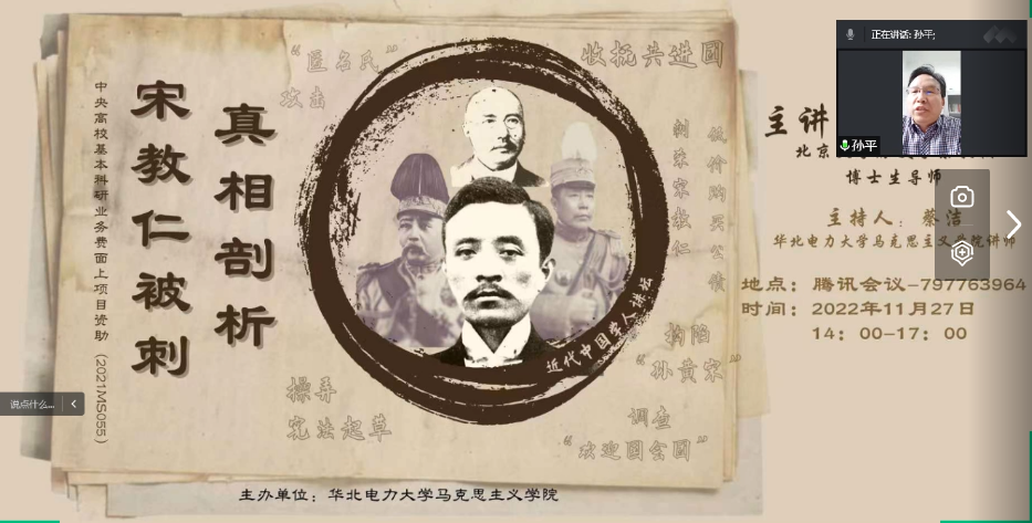 11月27日下午,北京大学历史学系教授、博士生导师尚小明应邀为我校师生以线上形式作题为“宋教仁被刺真相剖析”的学术报告。beat365中文登录入口党总支书记孙平、学院师生代表、以及校外数名高校及科研机构代表聆听了此次报告。本次学术报告由beat365中文登录入口中国近现代史纲要教研室教师蔡洁主持。