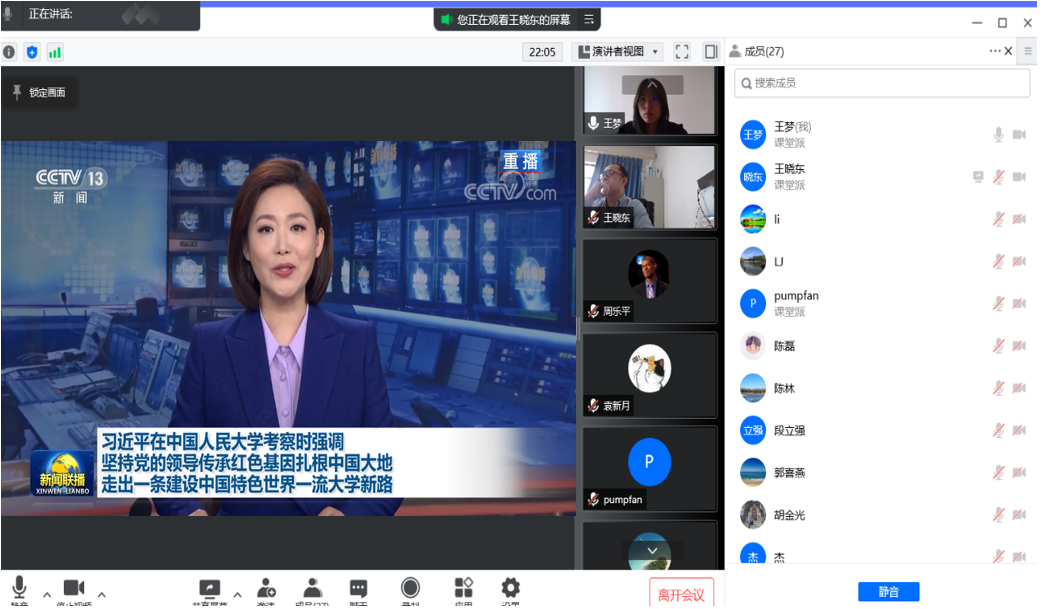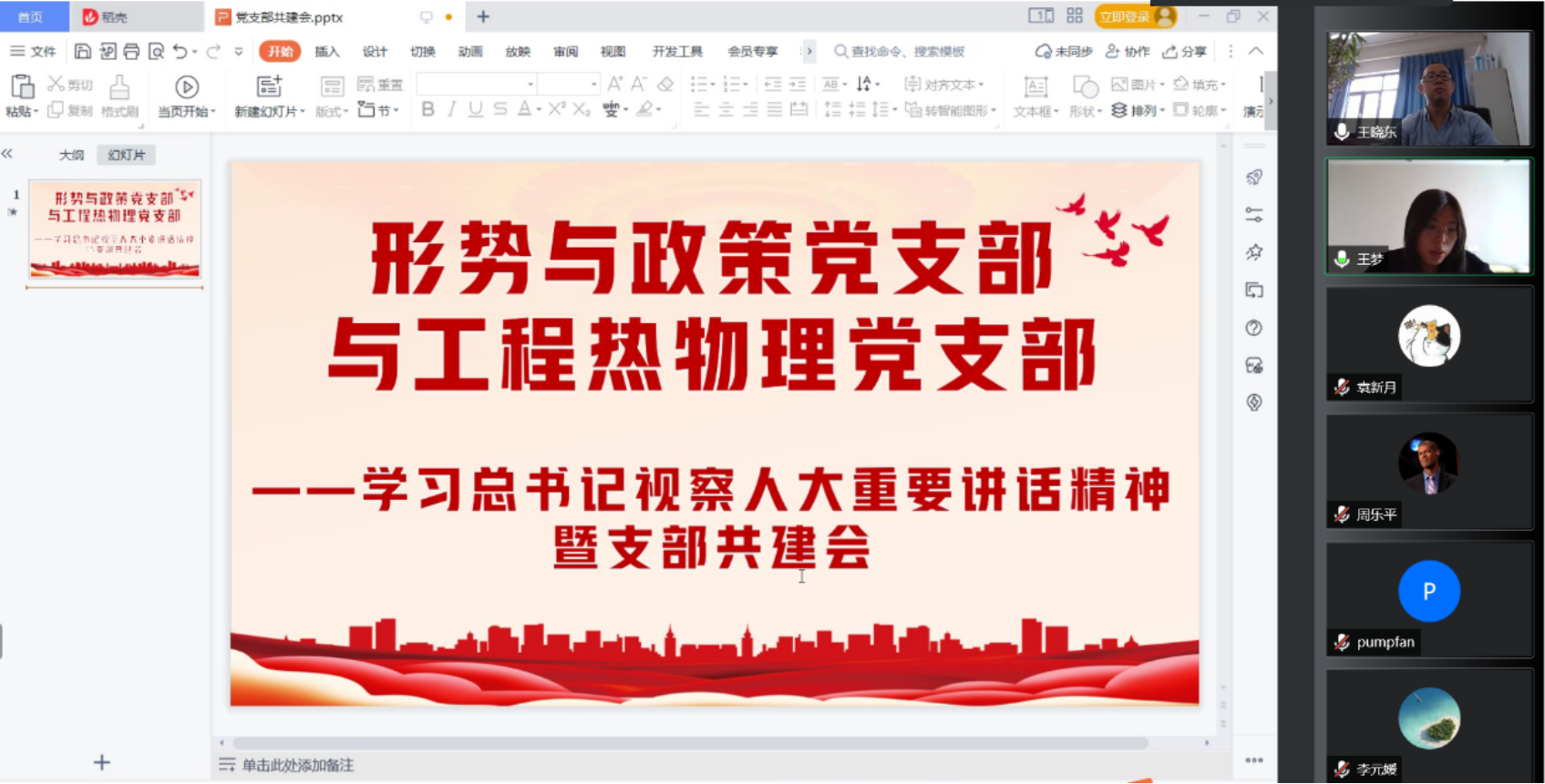 5月10日中午,beat365中文登录入口形势与政策党支部和能源动力与机械工程学院工程热物理党支部在线上开展共建联学活动,主题为学习总书记视察人民大学重要讲话精神,两个党支部近30名教师参加,会议由工程热物理党支部书记王晓东、形势与政策党支部书记王梦共同主持。