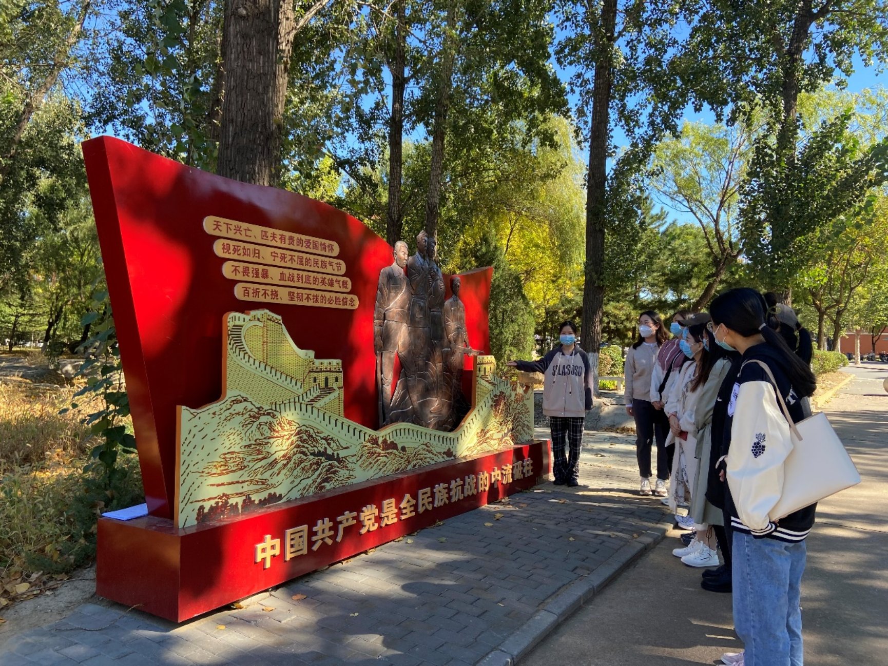 “抗日战争”党史事件微景观位于操场东南角外。红色旗帜下是金色的长城,是英雄们坚定的目光。1931年到1945年,中国人民历经14年的艰难曲折,最终取得了抗日战争的胜利,不仅使中华民族摆脱了来自帝国主义列强的压迫,更为世界和平作出了重大贡献。